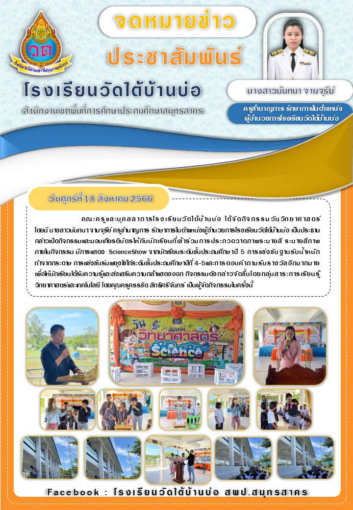 วันศุกร์ที่ 18 สิงหาคม 2566 คณะครูและบุคลลาการโรงเรียนวัดใต้บ้านบ่อ ได้จัดกิจกรรมวันวิทยาศาสตร์ โดยมี นางสาวนันทนา จามจุรีย์ ครูชำนาญการ รักษาการในตำแหน่งผู้อำนวยการโรงเรียนวัดใต้บ้านบ่อ เป็นประธานกล่าวเปิดกิจกรรมและมอบเกียรติบัตรให้กับนักเรียนที่เข้าร่วมการประกวดวาดภาพระบายสี ระบายสีภาพ ภายในกิจกรรม มีการแสดง ScienceShow จากนักเรียนระดับชั้นประถมศึกษาปี 5 การแข่งขันฐานรับน้ำหนักทำจากกระดาษ การแข่งขันร่มพยุงไข่ไก่ระดับชั้นประถมศึกษาปีที่ 4-5และการตอบคำถามรับรางวัลอีกมากมาย เพื่อให้นักเรียนได้รับความรู้และส่งเสริมความกล้าแสดงออก กิจกรรมดังกล่าวจัดขึ้นโดยกลุ่มสาระการเรียนรู้วิทยาศาสตร์และเทคโนโลยี โดยคุณครูครรชิต สิทธิศรีจันทร์ เป็นผู้จัดกิจกรรมในครั้งนี้